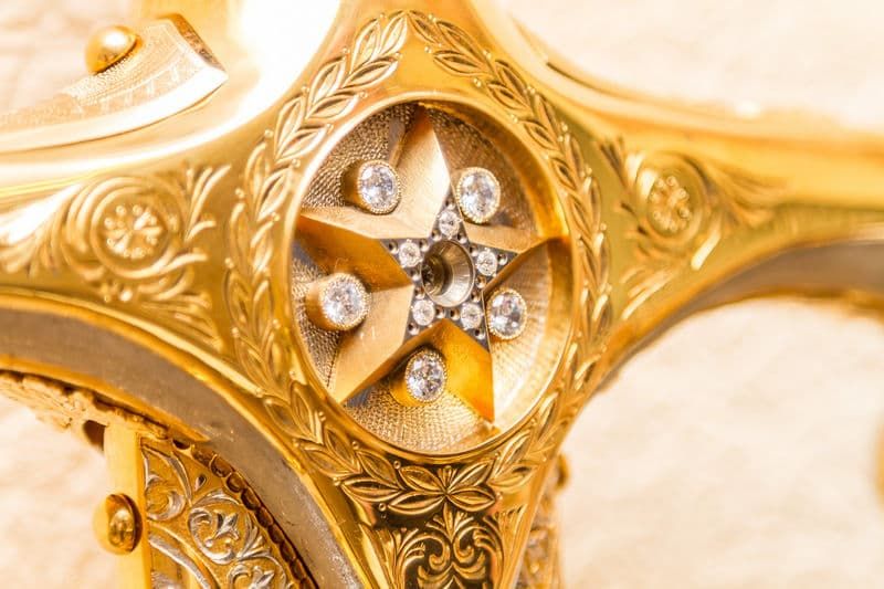 Ниже по рукояти расположились барельефы двух значимых памятников, каждый на отдельной детали. У «Родины-мать» с обратной стороны - символ «Щит и меч» с надписью 70 лет Победы. На другой детали - объемное изображение монумента Воину-освободителю и орден победы. Ниже маршальская звезда, она находится в центре гарды. Это перекрестие, отделяющее рукоять от клинка, потребовало творческого подхода, терпения и профессионализма от слесаря и гальваника. Работать с медью трудно, металл мягкий, нельзя зажать в тесках. Мастеру-оружейнику пришлось трижды возвращаться к гарде, пока не получилась «идеальная» форма, какую планировали. Для гарды были использованы две технологии гальванопластики: первая - изготовление по резиновым формам и вторая – наращивание меди поверх материала. Первоначально была изготовлена пластилиновая гарда. Затем на пластилин был нанесен слой меди, он был доработан. Была снята резиновая модель. Затем с резиновой модели снята восковая модель. На воск нанесена медь, то есть изготовление прошло три этапа. Гарду украшают маршальские погоны – эта копия настоящих. Их украшают герб, звезда – каждая деталь выточена и обработана вручную.