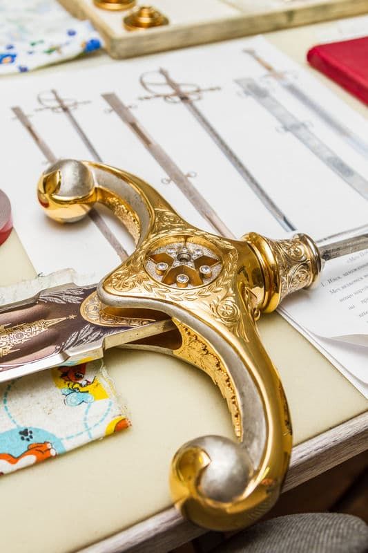 Неповторимой деталью этого меча – стали ножны. Их уникальная особенность и в символике, и в изготовлении. История холодного оружия России еще не знала памятного клинка, посвященного Маршалам Победы. Их девять – сталинских полководцев. Галерею портретов возглавляет сам Верховнокомандующий. В изготовлении рамки была применена гальванопластика, использовалась подрезка, подгонка требовала высшего пилотажа. Сами портреты выполнены в стиле пуантилизма. Точечный метод нанесения был освоен художниками-граверами оружейной фабрики в середине прошлого века. Об этом направлении в искусстве уральских мастеров хорошо известно ценителям златоустовской гравюры. Нанести миллион точек – работа, и без того, кропотливая. Но мастера пошли дальше – портреты маршалов выполнены в миниатюре. Художнику-портретисту приходилось работать только с увеличительным стеклом.