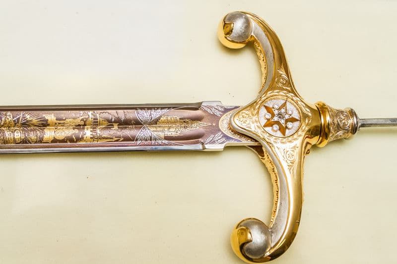 Только златоустовские мастера могут так виртуозно написать историю Великой Победы на одном клинке. Идейный замысел передают самые значимые символы войны: памятник Родина-мать, монумент Воину-освободителю в берлинском Трептов-парке, орден «Победа», Спасская башня, поверженный Рейхстаг. И конечно, портреты самых выдающихся полководцев Великой Отечественной войны, ведь памятный клинок создатели назвали меч Маршалов Победы. В этом произведении златоустовских оружейников воедино слились история Отчества и их мастерство.